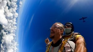 Board the C182 skydive plane. You’ll ascend into the sky for a comfortable 25-minute climb, during which you can enjoy breathtaking views on the way up to the jump altitude of 10,000 feet (3 km).